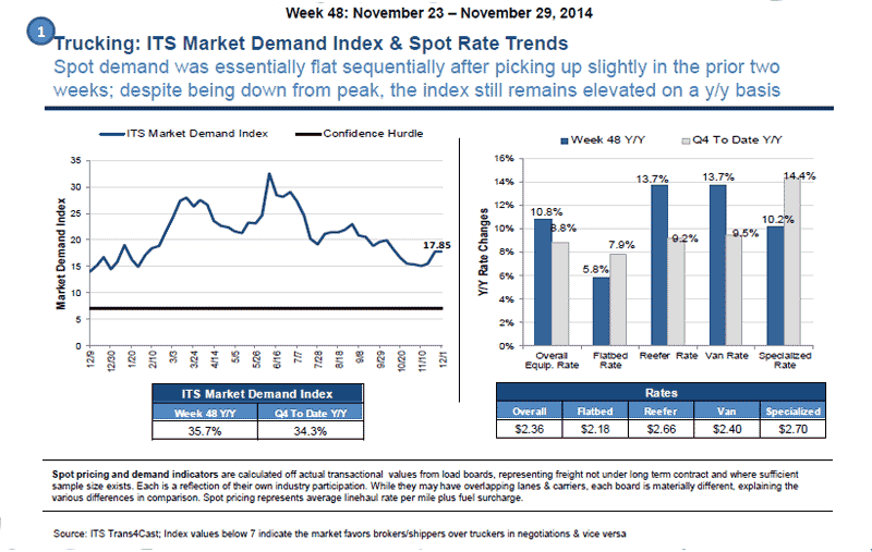 • Spot demand was flat to up on a sequential basis in Week 48. The ITS Market Demand Index (MDI) measured 17.85 in