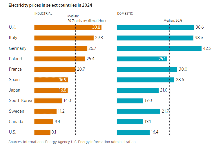 This puts UK, Germany and other high-cost countries at a huge competitive disadvantage, with the Journal piece citing examples of manufacturers saying they were shutting down Euro operations due to high energy costs.