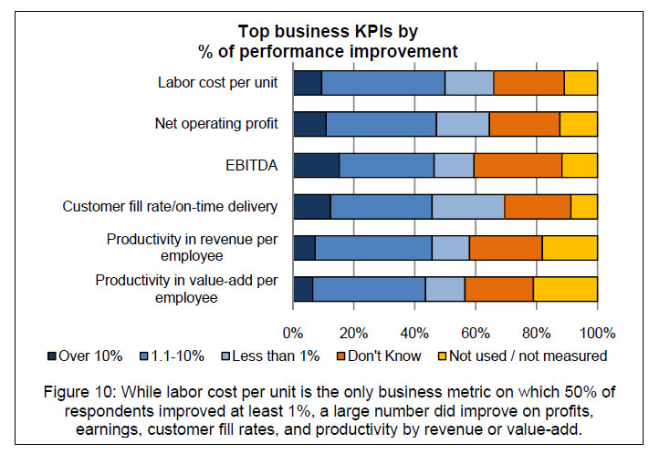According to the research, in only one area did more than 50% of the survey respondents improve performance by 1% or more: Labor cost per unit. Even that data is a little bit suspect, as the survey was taken in late 2009, amidst the Great Recession when most manufacturers had dramatically cut back on employment, meaning that result may have been an aberation.