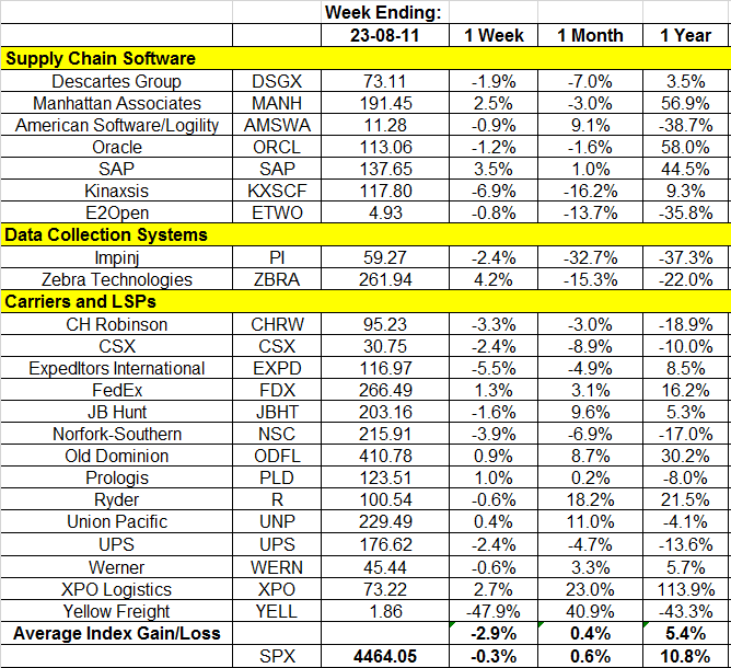 In SCDigest's weekly review of the stock market performance across a group of over 20 supply chain software and hardware firms, as well as freight carriers and logistics service providers, it was a modet bad week on Wall Street, with the S&P 500 dropping 0.3%. However, our supply chain and logistics stock index fell 2.9%, based on a giant fall in one stock, using an unweighted average.