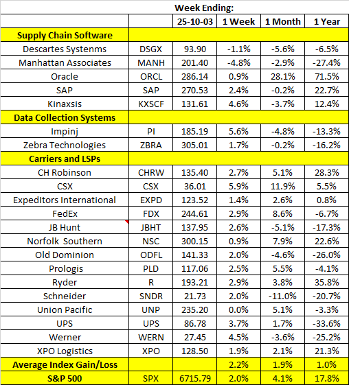 In SCDigest's weekly review of the stock market performance across a group of over 20 supply chain software and hardware firms, as well as freight carriers and logistics service providers, it was another up week on Wall Street, with the S&P 500 rising 2.0%, while our Index for the week was about the same, up 2.2%, using an unweighted average.