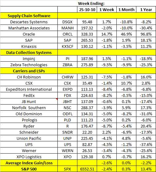 In SCDigest's weekly review of the stock market performance across a group of over 20 supply chain software and hardware firms, as well as freight carriers and logistics service providers, it was big down week on Wall Street, with the S&P 500 falling 2.4%, while our Index for the week was about the same, down 2.6%, using an unweighted average.