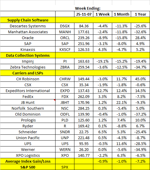 In SCDigest's weekly review of the stock market performance across a group of over 20 supply chain software and hardware firms, as well as freight carriers and logistics service providers, it was a bit of a down week on Wall Street, with the S&P 500 falling 1.6%, while our Index for the week was also down a bit, falling 0.9`%, using an unweighted average.