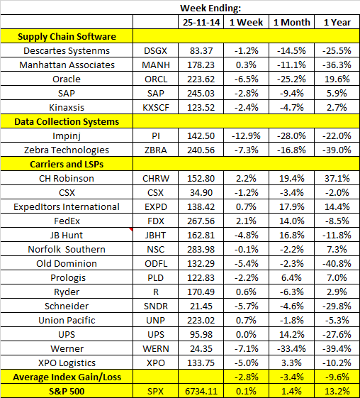 In SCDigest's weekly review of the stock market performance across a group of over 20 supply chain software and hardware firms, as well as freight carriers and logistics service providers, it was a flat week on Wall Street, with the S&P 5001 up just 0.1%, while our Index for the week was down, falling 2.8%, using an unweighted average.