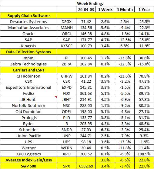 In SCDigest's weekly review of the stock market performance across a group of over 20 supply chain software and hardware firms, as well as freight carriers and logistics service providers, It was a up week on Wall Street last week, with the S&P 500 rising 3.4%, while our Index for the week was up a little more, increasing 3.8%, using an unweighted average.