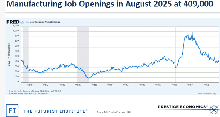 I include two slides from his excellent presentation. The first shows that despite a recent decline, there are still lots of manufacturing jobs, with 409,000 openings in the US as of August:
