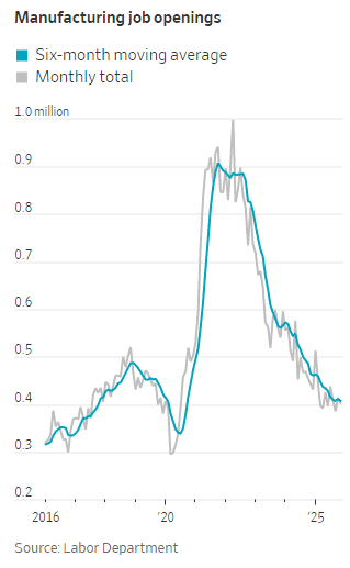 The WSJ piece adda this: “The manufacturing boom President Trump promised would usher in a golden age for America is going in reverse. After years of economic interventions by the Trump and Biden administrations, fewer Americans work in manufacturing than any point since the pandemic ended.”