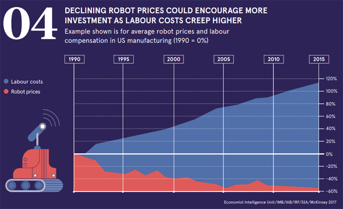 As shown in the chart below, recently published on the Racounter web site based on data from The Economist magazine, McKinsey and others, the costs of robots continue to decline, while the costs of labor march ever higher: