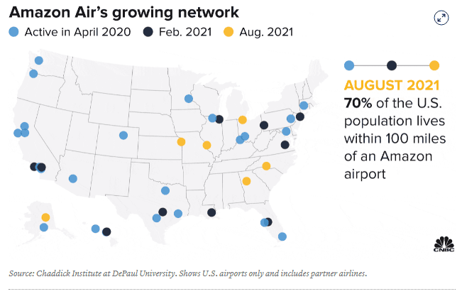 This week, CNBC used data from the report to created an animated graphic showing the growth in the percent of the US population that lives within 100 miles of an airport served by Amazon Air, and airports added in each of three phases: the state of affairs in April 2020 as the startng point, and then expansion as of February 2021 and then just again in August.