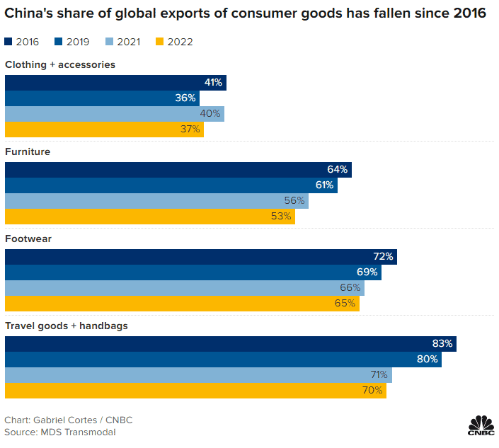 As seen in the chart below, China’s share of global exports in apparel and accessories has fallen from 41% in 2016 to 37% so far in 2022; in furniture from 64% to 53%; in footwear from 72% to 65%, and in luggage and handbags from 83% to 70%.