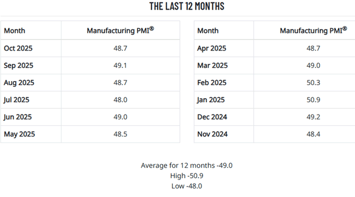 The US Purchasing Managers Index (PMI) for October was released Monday by the Institute for Supply Management (ISM), and came in at a level of 48.7, a little down from 49.1 in September, falling below the key 50 mark that separates US manufacturing expansion from contraction for 34 out of the last 36 months