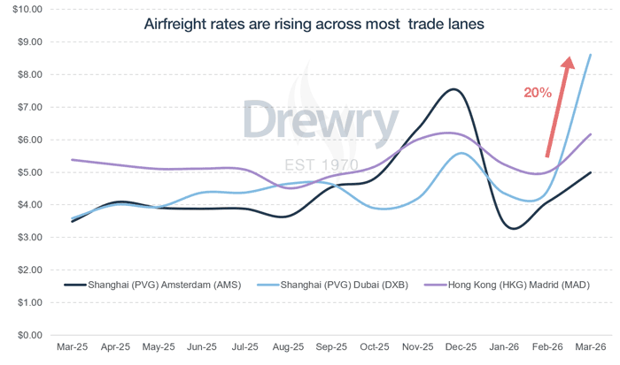 According to Drewry Airfreight Insight, airfreight rates from Shanghai to Dubai have soared 95% since the start of the war, to $8.60. Rates could exceed the 2020 pandemic record of $9.40 if fuel surcharges continue to rise.
