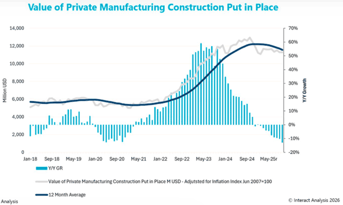 As a result, Interact has downgraded its outlook for new factory construction in the US. The slowdown in new project applications signals reduced momentum in greenfield development, which is now feeding through into its forecast.